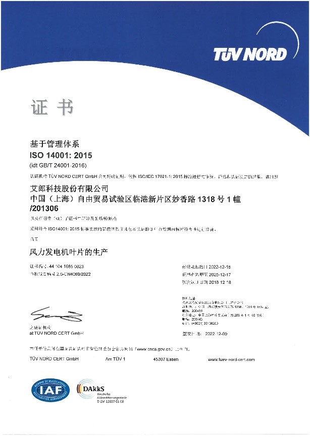 Aeolon Technology Co., Ltd.and its five subsidiaries passed the ISO 14001:2015 Environmental ManagementSystem and ISO45001:2018 Occupational Health and Safety Management Systemcertificates issued by TUV NORD (Hangzhou) on December 9, 2022.