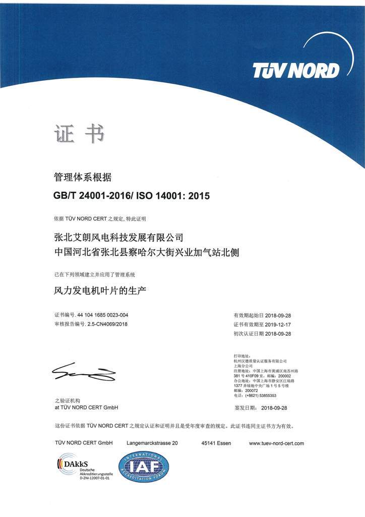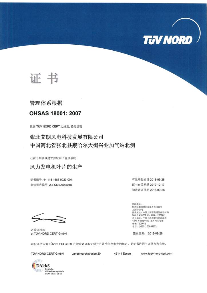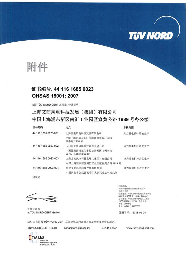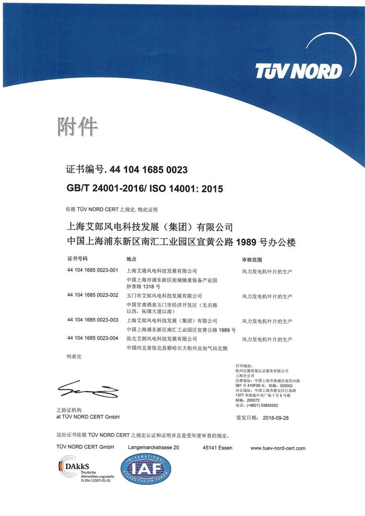 上海艾郎集团中心办公室、南汇工厂、临港工厂、玉门工厂顺利通过ISO14001:2015版换证及OHSAS18001:2007版监督审核。上海艾郎风电科技发展(集团)有限公司张北工厂于2018年9月28日取得TUV NORD签发的ISO14001:2015环境管理体系及OHSAS18001:2007职业健康安全管理体系审核认证证书。张北工厂是继集团公司中心办公室、临港工厂、玉门工厂、南汇工厂通过双体系认证之后,获得认证通过的集团第四家工厂。