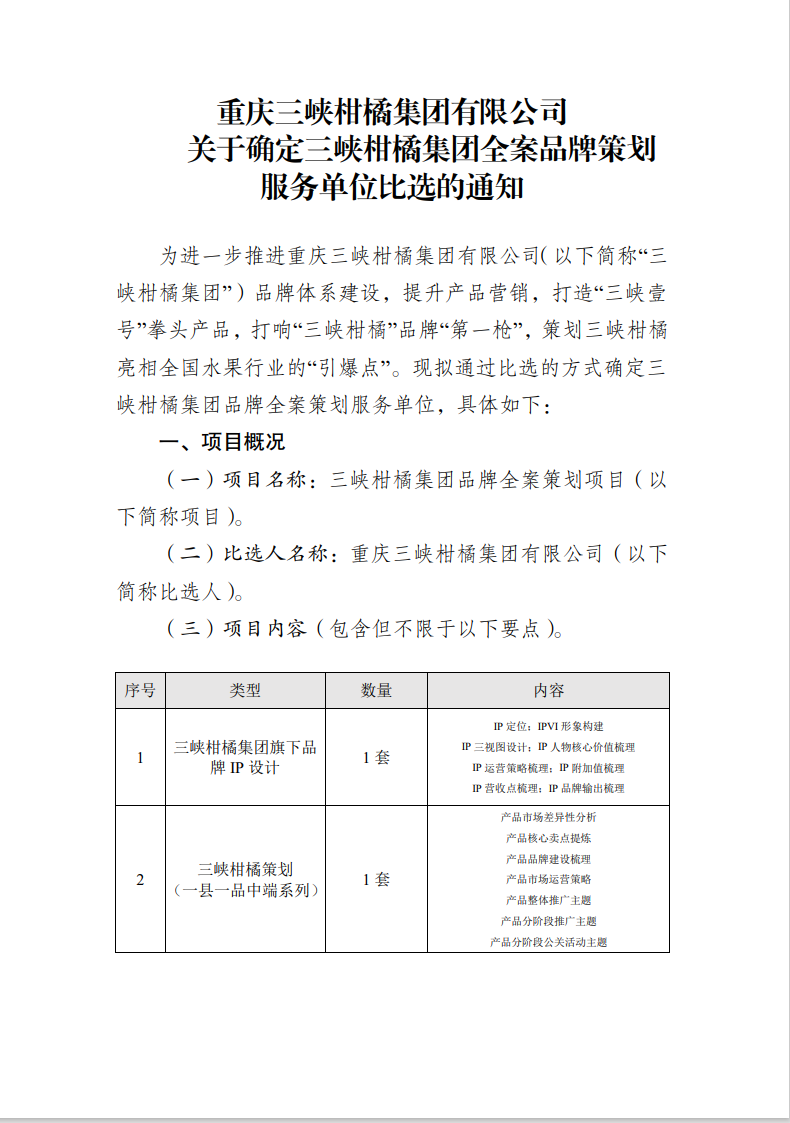 重庆三峡柑橘集团有限公司关于确定三峡柑橘集团全案品牌策划服务单位比选的通知
